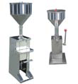 原理及特点: 该灌装机容量为50g,使用时旋转容量调节钮,观看刻度表。指针对准你所需的容量,然后扳动手柄试灌。