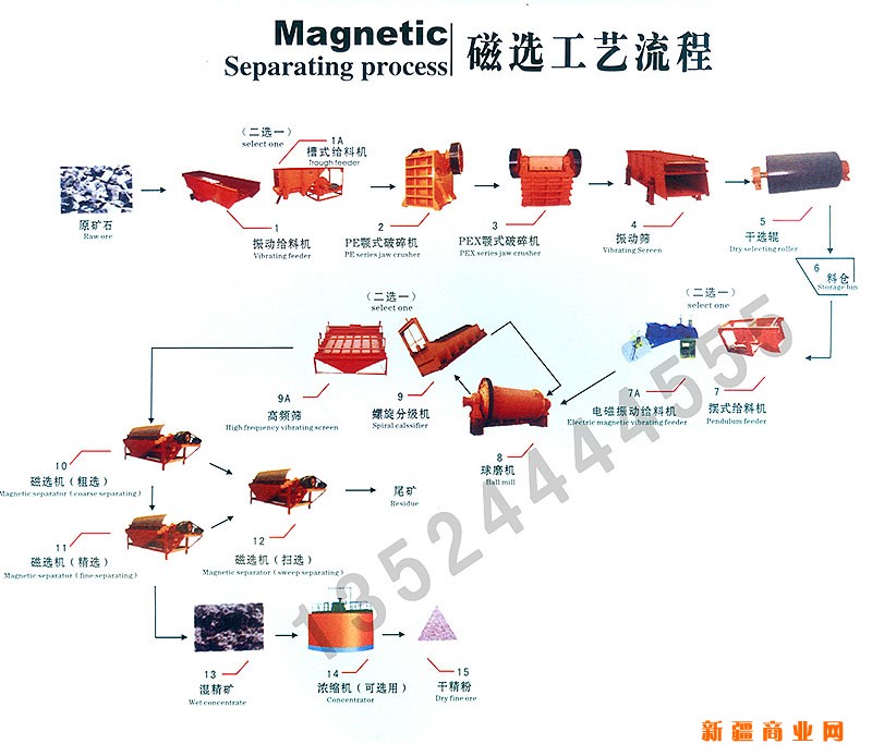 菱铁矿选矿设备,开采的矿石先由颚式破碎机进行初步破碎,在破碎至合理细度后经由提升机、给矿机均匀送入球磨机,由球磨机对矿石进行粉碎、研磨。经过球磨机研磨的矿石细料进入下一道工序:分级。螺旋分级机借助固体颗粒的比重不同而在液体中沉淀的速度不同的原理,对矿石混合物进行洗净、分级。经过洗净和分级的矿物混合料在经过磁选机时,由于各种矿物的比磁化系数不同,经由磁力和机械力将混合料中的磁性物质分离开来。经过磁选机初步分离后的矿物颗粒在被送入浮选机,根据不同的矿物特性加入不同的药物,使得所要的矿物质与其他物质分离开。在所要的矿物质被分离出来后,因其含有大量水分,须经浓缩机的初步浓缩,再经烘干机烘干,即可得到干燥的矿物质。